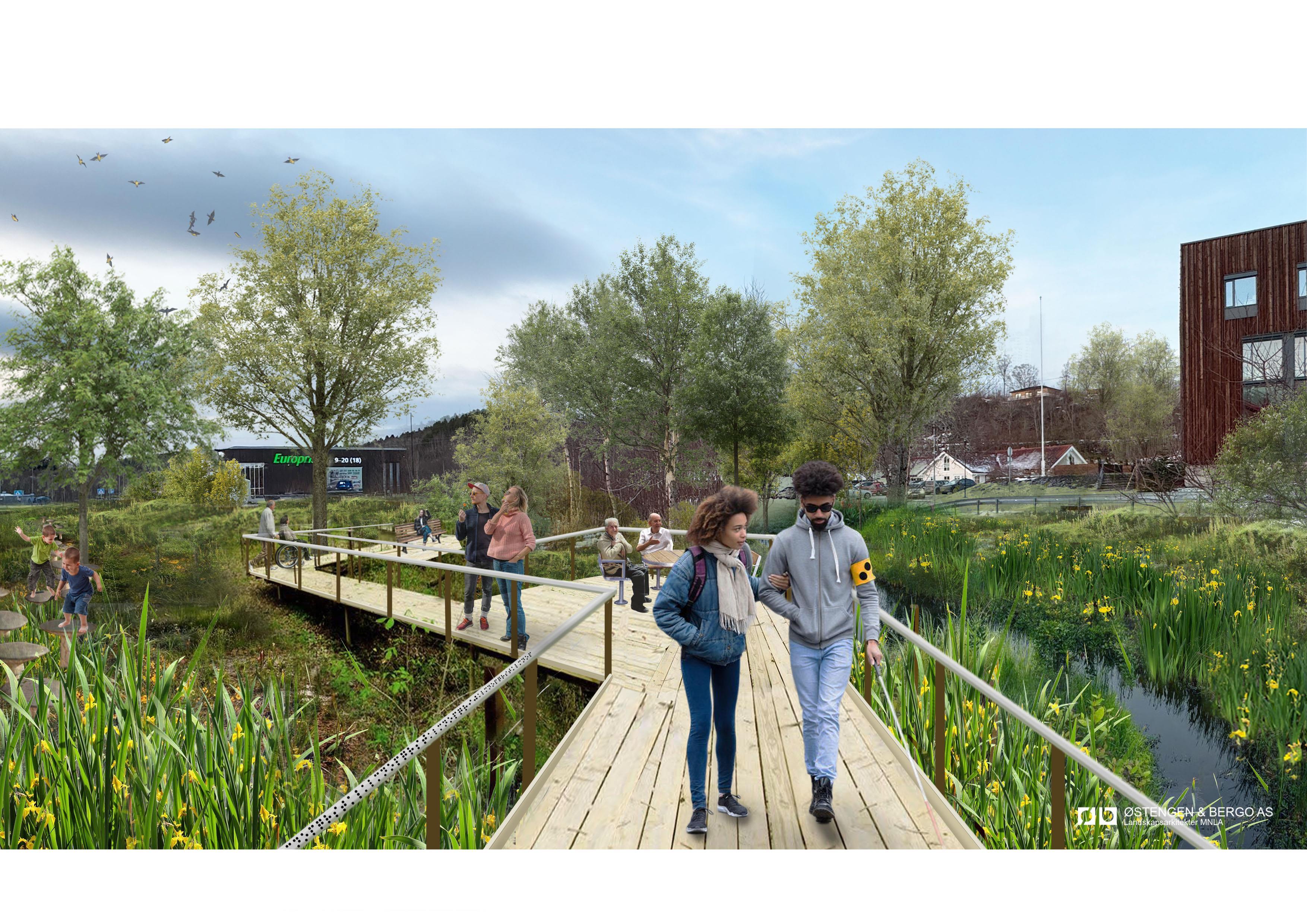 Elveparken skal åpne elva og gjøre den tilgjengelig for alle. Lokal, lite skjøtselskrevende vegetasjon skal bidra til