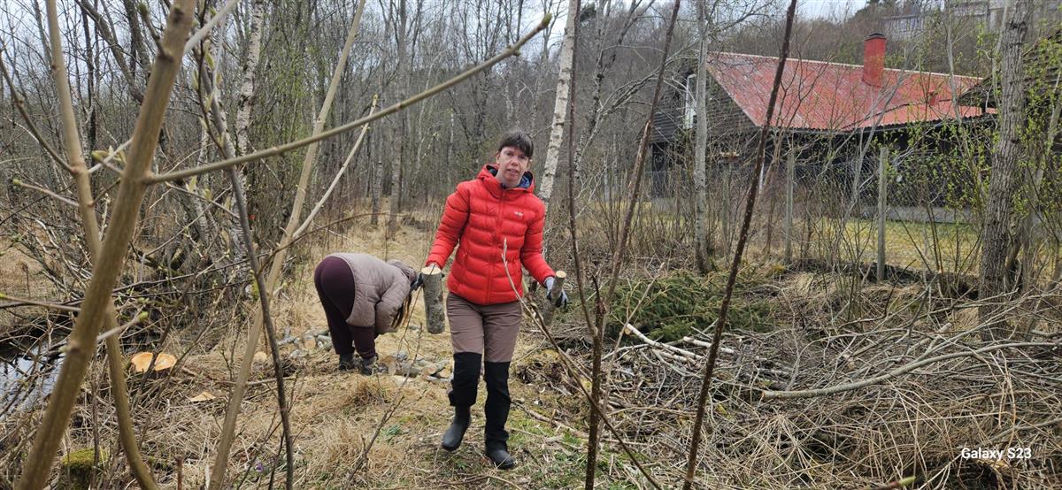 De rydder søppel som de finner i skogen og langs elva, klipper kvist og bærer ut stranger som skal bli til ved. Det har vært nødvendig å fjerne et lite antall nedfallstrær og knekte greiner.